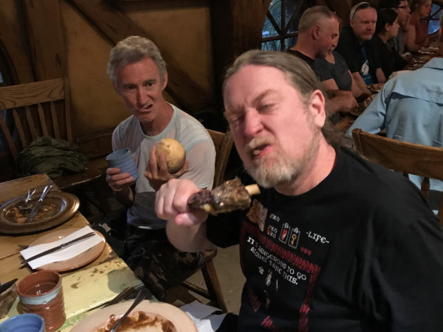 The lights start to come on in the Hobbit holes. And the Green Dragon is beckoning with music and lights. Every tour ends at the Green Dragon with a complimentary drink: beer, cider, tea and coffee. For the banquet tour, you’re just getting started. While you relax inside or out, enjoying your beverage and the sights, playing with Skittles the Pub Cat, you can smell something delicious!