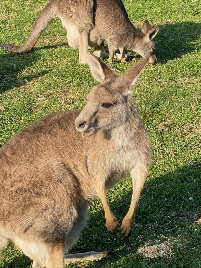 Walking past an open grassy lot, backed by forest, we spotted the mob lazing and grazing in the sun. They went on high alert as I squealed quietly to Glenn, kangaroos!