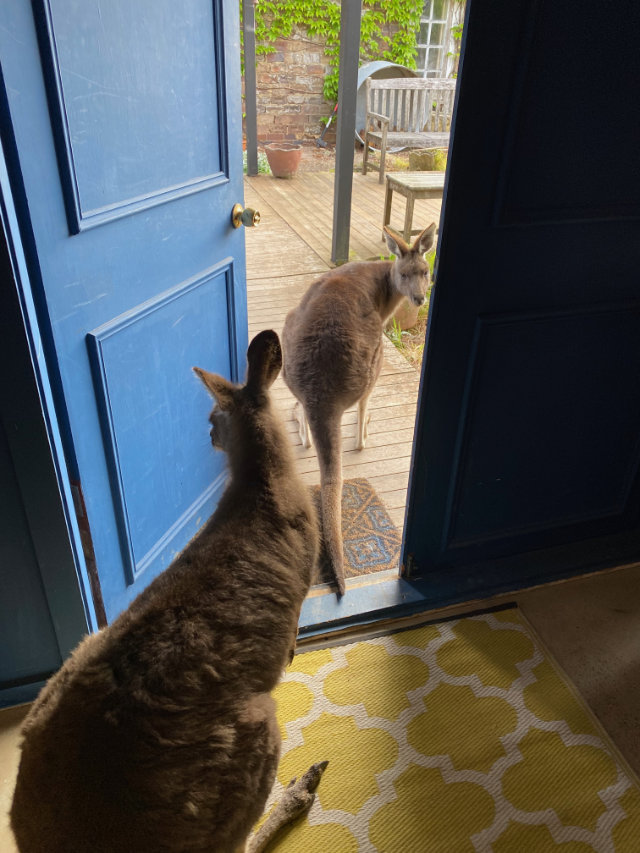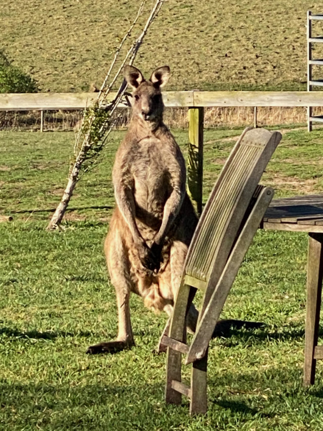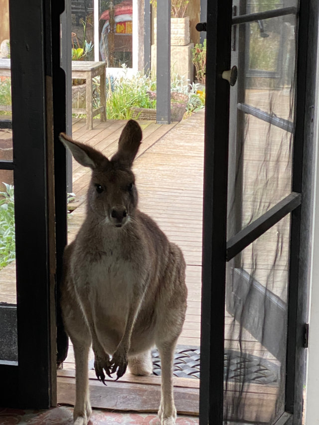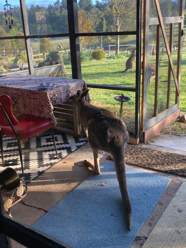While I was puttering around, making a fire in the cast iron stove and brewing coffee, I heard a noise at the screen door, and expecting Glenn, I turned to see a large grey kangaroo waiting expectantly.