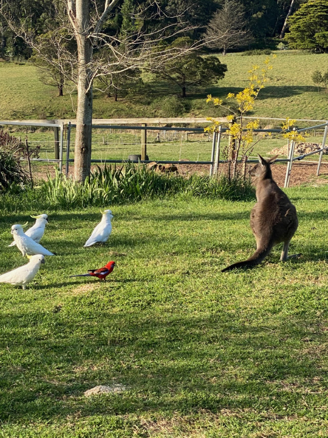 We drove in later in the day to check into Skye’s place. It was more charming and wonderful than we could have ever expected. Rustic and haphazard, cozy and full of art and wonderful finds. We did see kangaroos in the distance. And the yard was full of cockatoos and parrots squawking away before they roosted for the night.